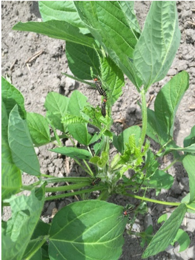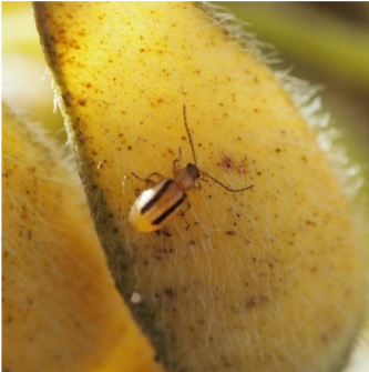 被害の様子:成虫は葉、子葉、莢、茎などを食害する。 莢の表面に食害を受けると変色し、子実にも黒斑ができて品質が低下する。 幼虫は根粒を食害するため、多発地域では根粒食害による生育及び収量低下がおこる可能性がある。