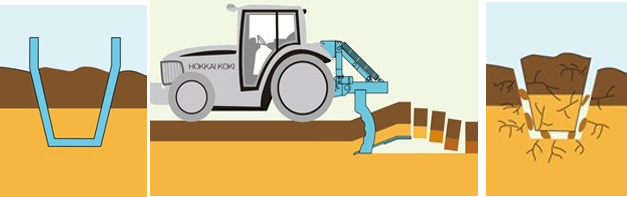 心土破砕には、下層土に亀裂を入れることで、空気を下層まで入れたり、鋤床上に溜まる余剰な水を下層に移動させる効果があります。