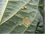 ダイズわい化病(ジャガイモヒゲナガアブラムシで伝搬される)の縮葉症状(原図:本多健一郎)