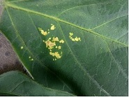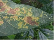 ダイズわい化病(ジャガイモヒゲナガアブラムシで伝搬される)の黄化症状(原図:本多健一郎)