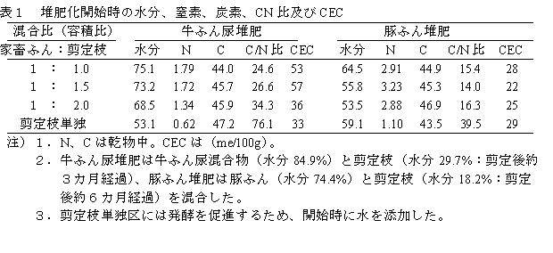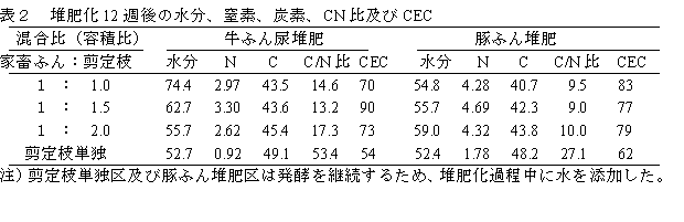 家畜ふんの堆肥化に副資材として果樹剪定枝(梨)を活用する。牛ふん尿混合物及び豚ふんに対する粉砕剪定枝の混合は堆肥化を促進する。その合理的混合量(容積比)は1.5倍量及び同量である。