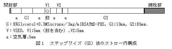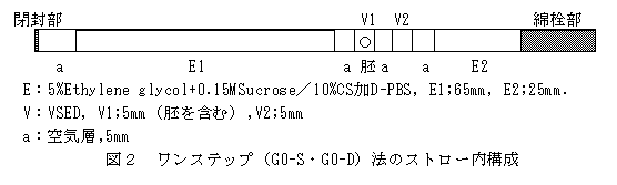 - ガラス化保存は、融解及び移植法の違いにより、ステップワイズ法(GS法)、ワンステップ法(G0-S法)、ワンステップ直接移植法(G0-D法)の3通りとした。凍結手法は、石森ら(1992)の方法に準じ実施した。切断後、約4時間修復培養の後胚を50%濃度のVSED(25%エチレングリコール、25%ジメチルスルホキシド/4mg/mlBSA加D-PBS)に60 秒間平衡した後、VSED(100%濃度)に移し、移動直後から約30秒以内に0.25mlプラスチックストローへ充填し、約30秒程度の経過を待って液体窒素ガス中に静置し、3分後に液体窒素中に浸漬し保存した。ストロー内構成は、GS法は図1に、G0-S・G0-D法は図2に示した。これらの操作はすべて室温下で実施した。