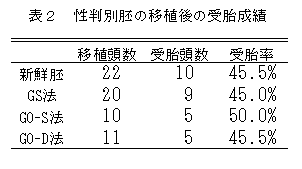 - ガラス化保存を行った性判別胚の移植後の受胎率は、融解方法による差はなく、新鮮胚と同等の受胎率が得られた(表2)。また、GO-D法においても比較的高い受胎率(45.5%)であった。