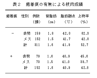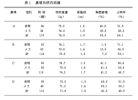 生産段階における慢性疾病の浸潤状況が枝肉資質におよぼす影響を検討するため、県内4農場から出荷された計463頭の枝肉について、慢性疾病浸潤の指標として枝肉の胸腔内癒着痕の有無と枝肉の格付、背脂肪厚、腹腔内脂肪融点、肉・脂肪色調を調べた。胸腔内癒着痕の無い枝肉は、癒着痕のある枝肉に比べて上物率と脂肪融点が高く、品質的に優れている。