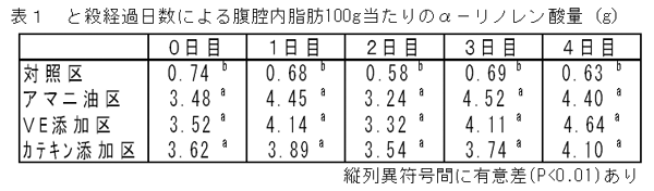- 腹腔内脂肪のα-リノレン酸量は、各区とも4℃冷蔵庫保存でと殺後4日間を経過しても減少しない。また対照区に比べアマニ油脂肪酸カルシウムが添加された各試験区で多く含まれたが、各試験区間に差は認められない(表1)。