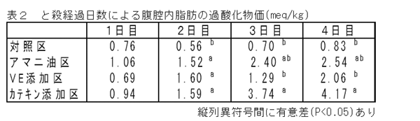 - 腹腔内脂肪の過酸化物価(以下PV)は、と殺後4日間の4℃冷蔵庫保存で、アマニ油脂肪酸カルシウムが添加された各試験区においても酸化に問題はない(表2)。