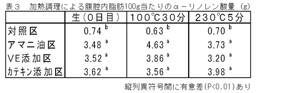- と殺当日の腹腔内脂肪のα-リノレン酸量は、生と加熱調理(100℃30分ボイルと230℃5分ホットプレート加熱)ともに対照区に比べアマニ油脂肪酸カルシウムが添加された各試験区で多く含まれたが、各試験区間に差は認められない(表3)。