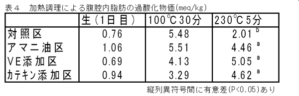 - と殺当日の腹腔内脂肪のPVは、加熱調理(100℃30分ボイルと230℃5分ホットプレート加熱)をしても酸化に問題はない。また各試験区間に差は認められない(表4)。