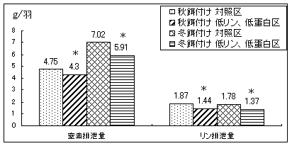 肉用鶏に市販アミノ酸とフィターゼを添加した低蛋白、低リン飼料を給与すると窒素で10~15%、リンで約22%の排泄量を低減でき、飼料消費量に対するふん乾物排泄量の割合も約10%少ない。