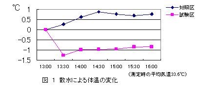 最も暑い13:00計測の体温を基準値0に設定した時、試験区の体温は対照区に比べ、約1℃低下していた(図1)。日中の散水で舎内温度は約1.7℃低下した(図2)。