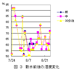 舎内の湿度は散水前(平均66.9%)、散水中(平均66.5%)、散水30分後(平均64.9%)で、ほとんど変化が認められなかった(図3)。