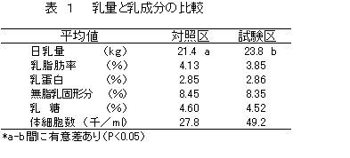 平均日乳量は(表1)に示すとおり、有意な差が認められた(P<0.05)。