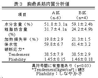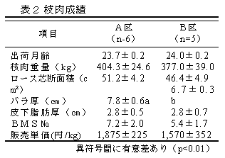 黒毛和種の肥育経営においては、肉質重視による肥育期間の長期化が生産コストの増加を招いている。そこで黒毛和種去勢牛を用い、7ヶ月齢到達時を0週として24週(12.5ヶ月齢)までを肥育前期、24~48週(12.5~18.0ヶ月齢)を中期、48~72週(18~23.6ヶ月齢)を後期として、肥育前期~中期にかけて高いDGに設定したA区と、肥育中期~後期に高いDGに設定したB区の2区に分け、枝肉重量400kgを目標に、7ヶ月齢から23.6ヶ月齢の計504日間飼養し枝肉成績、肉の理化学的特性等を調査し、効率的短期肥育技術について検討する。