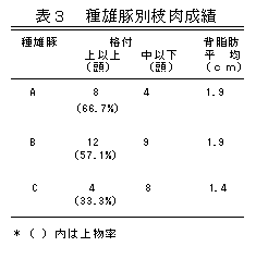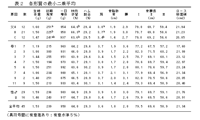 種豚の遺伝的能力を把握するためには、交配する種雌豚の影響(季節・産次も含む)が大きく正確な能力比較には困難が伴う。また直接検定は早期に能力判定ができるが、と体形質や遺伝的能力を把握するには不十分である。そこで同一種雌豚から同時に複数種雄豚の産子が得られる混合精液を用いて、種雄豚の能力把握とその正確性について検討した。