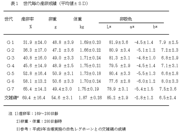 平成6年度からアロウカナ純粋種の改良を、産卵率で60%(短期検定、年間概ね200個)を目標とし、産卵性や卵殻色を基準に選抜を実施し、今年度までに産卵性の高いアロウカナ純粋種を作出した。