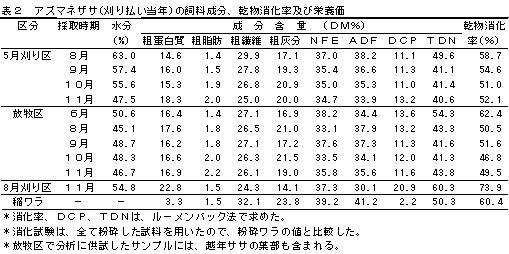 - 刈り払い当年葉部のDCP及びTDNについて稲ワラと比較したところ、DCPは5月刈り区、放牧区ともに稲ワラの5倍程度である。TDNは5月刈り区の8月と放牧区の6月では稲ワラと同程度であるが、5月刈り区の9月以降と放牧区の8月以降にそれぞれ稲ワラより低くなる。(表2)