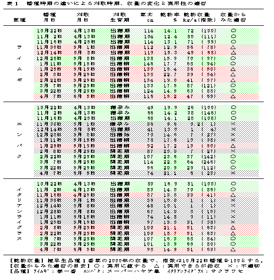 - ライムギは、10月下旬~11月半ば、12月下旬~1月上旬、および3月の播種における収量性が高い。11月末~12月半ば、1月下旬~2月下旬、4月上旬播種の乾物収量は10月下旬播種の50~80%に低下するが、冬期を中心とした播種時期の移動に対する適応が3草種の中で最も高い(表1上段)。