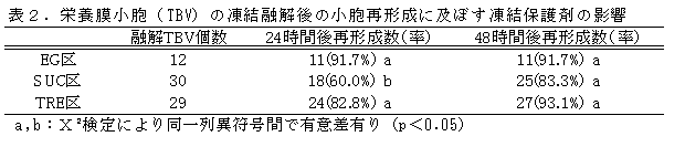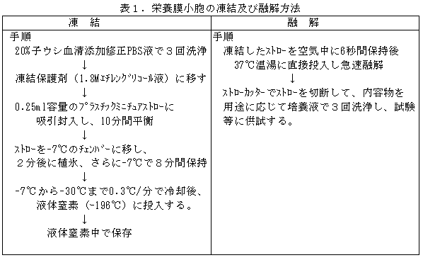 ウシの受精卵移植技術の普及には50%台の受胎率をさらに向上させる必要がある。最近、着床期胚の栄養膜細胞(Trophoblast)が産生するインターフェロンτが妊娠維持に重要な役割を果たしている可能性が報告されている。さらに栄養膜細胞を細切し、短時間培養後に形成される栄養膜小胞(Trophoblastic vesicle、以下TBV)を胚と共移植することにより、受胎率向上の可能性も報告されている。しかしTBVを胚と共移植するためには、TBVが常時使えるものがあることや、TBVと胚を同時に凍結保存できることが望ましいが、TBVの凍結保存については十分な知見が得られていない。