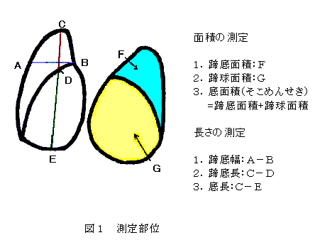- 蹄底面積、蹄球面積および底面積は、前肢、後肢とも、いずれの時点(30kg・60kg・90kg)でも外側蹄が内側蹄より大きな値を示した。また、各体重間の底面積の相関係数は、いずれも正の相関が認められた(P<0.05、P<0.01)。