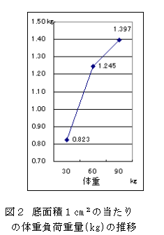 - 四肢の底面積1平方cm当たりの体重負荷重量は、体重が増加するに従い増加し、特に30kgから60kgでの負荷重量の増加量が、60kgから90kgの増加量より著しく大きな値を示した(図2)。なお、発育日数は、30kgから60kg、60kgから90kgともに40日前後と差は認められなかった。