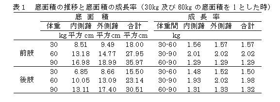 - 前肢、後肢とも、30kgから90kgまでの間に、底面積で約2.0倍、蹄底長・蹄底幅で約1.5倍、底長で約1.4倍に成長した。また、面積、長さとも30kgから60kgまでの成長率が、60kgから90kgまでの成長率より高い値を示した(表1)。