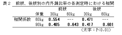 - 内外蹄比率は、いずれの時点でも前肢が後肢より大きな値を示した。また、各体重間の内外蹄比率の相関係数は、いずれも正の相関が認められた(表2)。