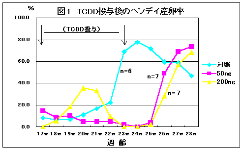 - 母鶏への TCDD 暴露 (50 and 200 ng/kg/week) は産卵を抑制したが、TCDD投与を中止したところ産卵は回復した(図1)。