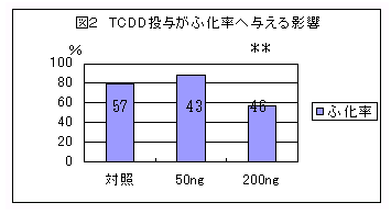 - 200 ng区のふ化率は、対照区より低く、このことは 母鶏への TCDD暴露が、ふ化に影響したことを示唆した(図2)。