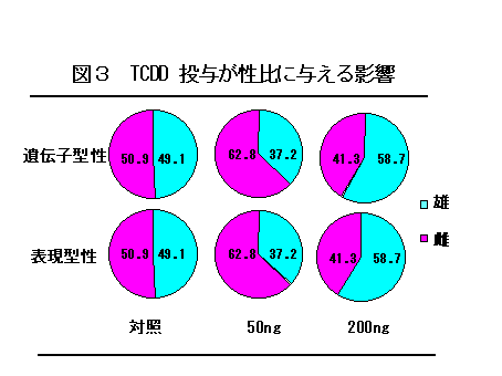 - 遺伝子型性は、対照区、 TCDD区ともに表現型性と完全に一致した。しかしながら、 200 ng区の性比 (雄 %) は対照区より高い傾向を示した(図3)。