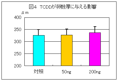 - さらに、TCDD 暴露は 200 ng区で卵殻を厚くした(図4)。