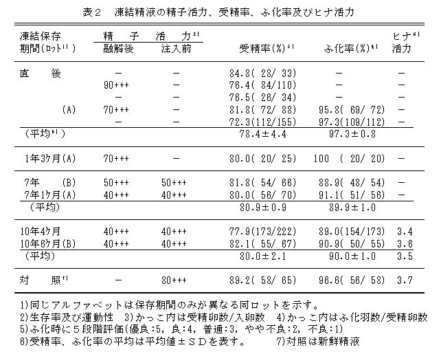 長期間保存後もニワトリ凍結精液の精子活力は良好で、受精率及びふ化率はそれぞれ約80%、約90%と高く、ヒナ活力も十分で、保存期間の違いによる差がみられなかった。凍結精液技術はニワトリにおいても品種・系統の保存、繁殖、育種改良に有効である。