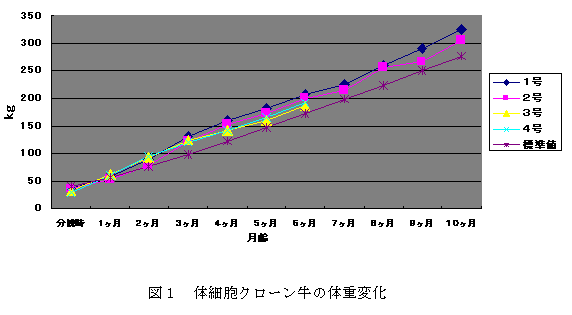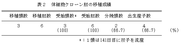 スーパーカウの卵丘細胞を利用して核移植操作を行い、クローン胚を作出、未経産牛に移植することによって、体細胞クローン牛4頭(双子2組)を生産した。出生後のクローン牛の状態及び発育は良好である。