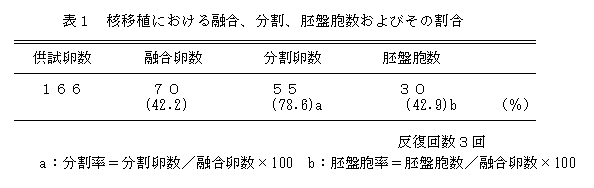 ドナー細胞として経膣採卵時に得られた卵丘細胞を、レシピエント卵子として屠場由来のF1卵子をそれぞれ使用した。核移植操作および細胞融合処理後、胚盤胞に発生した再構築胚を発情後7日目のホルスタイン種未経産牛3頭に、それぞれ2胚づつ移植した。