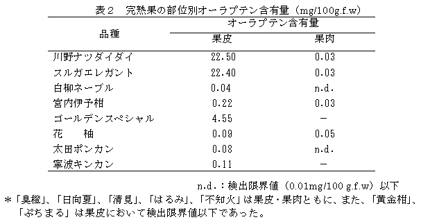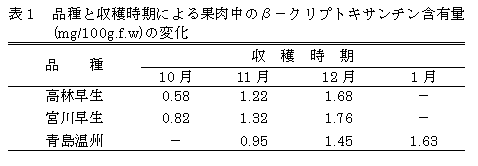 温州みかんの果肉中のβ-クリプトキサンチンは糖度の高い果実に多く含まれる。オーラプテンは「川野ナツダイダイ」などのダイダイ類やザボン類の果皮に多く含まれるが、果肉にも含まれる品種のあることが判明した。
