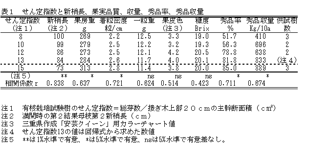 「安芸クイーン」の有核栽培は、果実の着色、食味が優れ生産者から注目されているが、花振るいによる着粒密度の低下が問題となっている。着粒密度を高めるには、弱いせん定が効果的であるが、せん定が弱すぎると、樹勢を落とす障害が発生するなどその程度が難しく、せん定強度と樹勢および着粒密度との関係を究明することが生産現場から求められている。そこで、せん定強度を芽数と主幹断面積の関係として指数化し、着粒密度、樹勢、果実糖度、着色との関係を検討する。