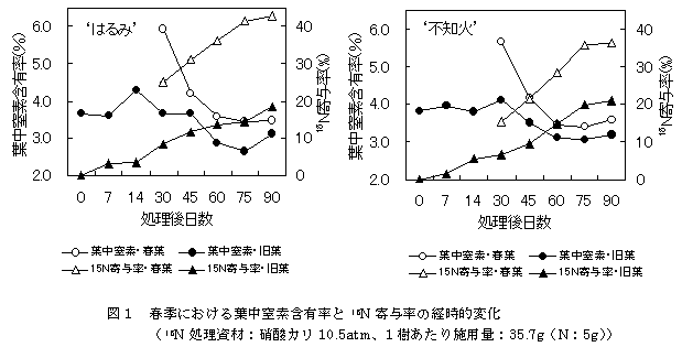 - 葉中窒素における3月30日に施用した15Nの寄与率の推移をみると、両品種ともに日数の経過につれて旧葉で微増することから吸収された窒素は旧葉に徐々に蓄積すること、発芽後は春葉での寄与率が旧葉に比べて高く推移することから窒素は春葉へ優先的に移行すること、特に「はるみ」でその傾向が強いこと、などが考えられる(図1)。