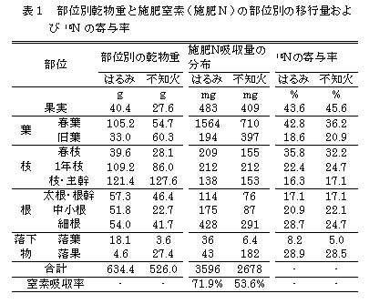 - 落花・落果中の15N寄与率が比較的高かったことから、着花が多く生理落果が多い場合は吸収した窒素の他器官への移行を阻害されることが懸念される(表1)。