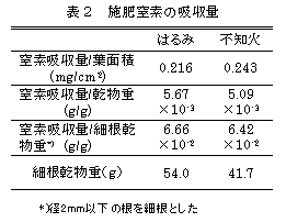 - 春季90日間での窒素の総吸収量は「はるみ」のほうが「不知火」より多く、窒素の吸収効率は「はるみ」のほうが優れる(表1)。「不知火」は細根の乾物重が少なく、細根乾物あたりの吸収量は「はるみ」と差が小さいことから、窒素の吸収量の多少は細根量の影響によるものと推定される(表2)。
