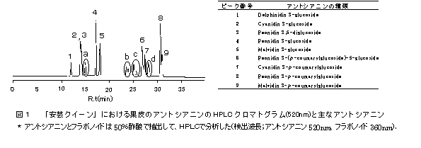 - 「安芸クイーン」における果皮のアントシアニンはpeonidin系が最も多く、次いで malvidin系、cyanidin系である(図1)。