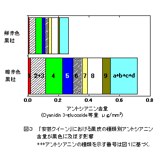 - 「安芸クイーン」果皮のアントシアニン組成は、暗赤色果粒と鮮赤色果粒で明らかな差は認められず、アントシアニン組成の変化が暗赤色果粒の発現に関与している可能性は小さい(図3)。