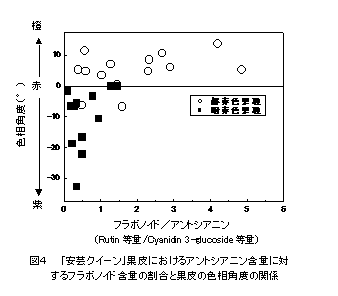 - 「安芸クイーン」における鮮赤色果粒の果色(色相角度)は赤~橙を示すのに対し、暗赤色果粒の果色は赤~紫を示す。「安芸クイーン」果皮のアントシアニン含量と果色には有意な負の相関関係が認められ、果皮のアントシアニン含量が約0.4μg/mm2より大きくなると、暗赤色果粒が発現する(図2)。