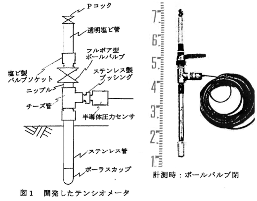 - テンシオメータは、Pコック、フルボア型ボールバルブ、ステンレス管を導入して構成され(図1)、中央部に位置するフルボア型ボールバルブで閉鎖した上部を空気溜め系、下部を計測系として、計測系内の負圧を半導体圧力センサで検知して土壌水分張力(マトリックポテンシャル)を測定する。なお、充填水は通常脱気水を使用するが、農家での使用を考慮して、普通の水道水を敢えて使用した。