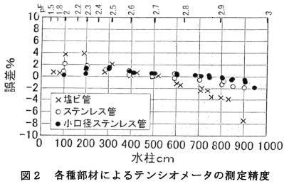 - 測定精度は、最初に半導体圧力センサ自体の精度をU字水銀計で確認したのち、半導体圧力センサを取り付けたテンシオメータのポーラスカップ部分を容器に入れて減圧し、U字水銀計で計測した。その結果、ステンレス管を導入することによりpF2.95(△900cm水柱)まで±2%誤差以下の高精度で計測でき、その上ステンレス管に丸棒を挿入することによって、溶脱空気の発生量が従来の1/100以下となった。