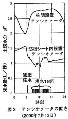- テンシオメータは、作物株から10cm、潅水チューブから10cmの深さ15cmに設置したが、テンシオメータ周囲の直径11cmを防根シートで覆って作物根の影響がない場合も測定してみると、両者の差は大きい(図3)。この差は作物根の直接的吸水に起因する。