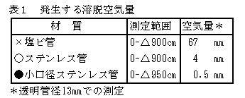 - 溶脱空気の発生量は、テンシオメータの計測系内の充填水量と、ポーラスカップを保持するテンシオメータ本体の材質に影響される(図2、表1)。そのため、計測系のテンシオメータ本体は圧力による収縮・膨脹のほとんどないステンレス管を採用した。更に、計測系内の充填水量が少ないほど溶脱空気量は減少するので、ステンレス管内に丸棒を挿入して充填水量を少なくした。