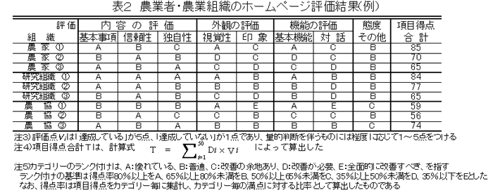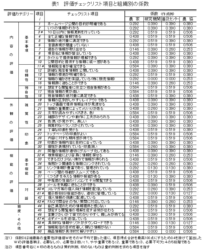 農業者・農業組織のホームページを改良するため、チェックリストを作成し、各項目の重要性評価から算出した係数によって、複数の組織に対応できる汎用性の高いホームページの評価手法を開発した。