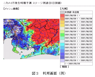 水稲の主要害虫ニカメイガを対象にメッシュ気象データを利用した発生時期予測システムを開発した。任意の日付の発育段階と、特定の発育段階への到達日を1kmメッシュ毎に値に応じて色分けして表示することができる。