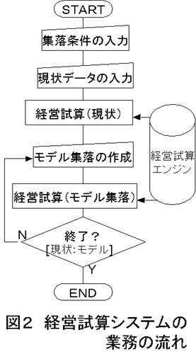 - 経営試算システムの主な業務の流れは図2に示す。現状集落と、新しい経営体の導入や受委託関係の変更などによって理想的な農業構造に組み替えたモデル集落との経営試算値を比較することによって、所得や労働時間の改善状況が農地利用集積のための経済的なインセンティブとなることを期待する。