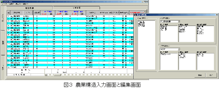 - 集落の農業構造は、表形式の入力フォームに個々の経営体情報を分類整理しながら入力して表現する。モデル集落を作成するための農業構造の組替え編集は、サブ画面上でマウスのドラッグ&ドロップ機能により簡単に行える(図3)。