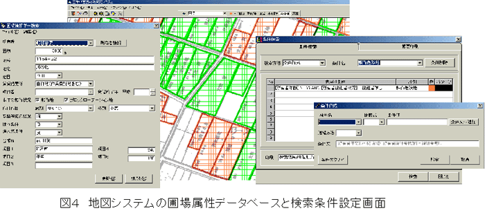 - 地図システムは農業構造シミュレーションの結果を圃場図として表示する。また単独で使用する場合には、データベース項目を対象とした条件検索ができる(図4)。圃場の位置データは、ユーザーレベルで簡単に入力できるようにイメージ図として取り込んだ地図を背景図として、マウス操作のみでベクトルデータとして登録できる。
